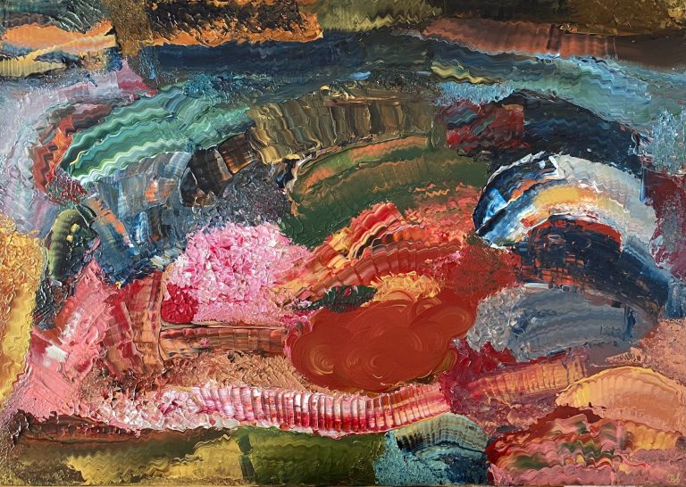 Schwere Blautöne breiten sich aus wie ein leiser Nachhall von "Bruder Jakob", tief und geheimnisvoll. Grün wächst darunter, erdig und still, ein Wald, in dem die Melodie sich verliert. Dunkles Rot pulsiert wie ein verborgenes Herz, zögernd zwischen den Schatten der Töne. Gold flackert auf, ein flüchtiger Glanz, der kurz die Dunkelheit durchbricht. Rosa schwebt leise wie menschliche Wärme, während Gelb nur flüchtig aufleuchtet - ein müdes Licht am Rand. Das Bild atmet, klingt und wandert.